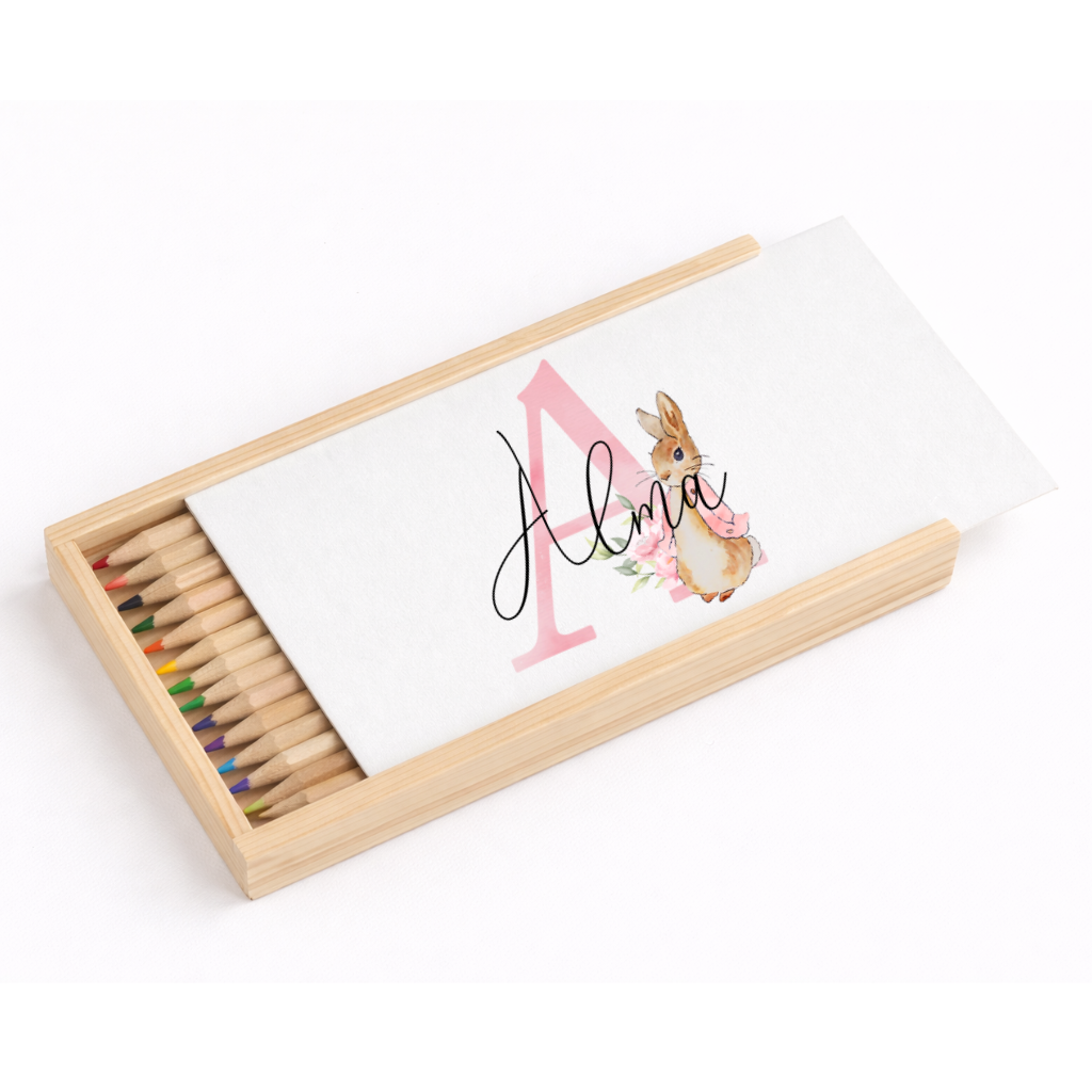 En personlig blyantæske i træ, der inviterer til kreativ leg, ro og nærvær. Æsken kan personliggøres med barnets navn og initial, hvilket gør den helt unik og ekstra sjov at bruge.