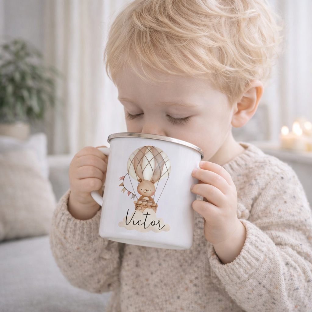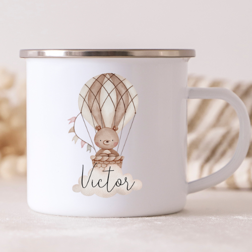 Trevlig och personlig barnkopp med en söt illustration med en nalle som flyger i luftballong för att ge sig ut på nya äventyr.