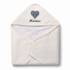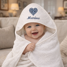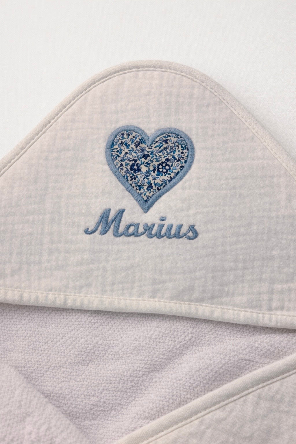 Babyhandduken med namn och hjärta är broderad med det populära Liberty-tyget.