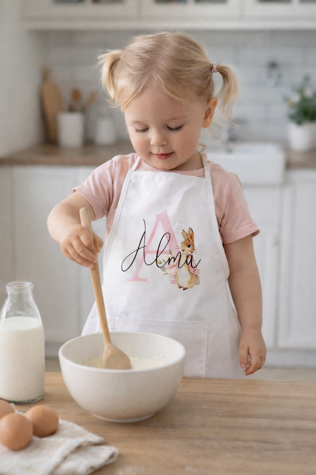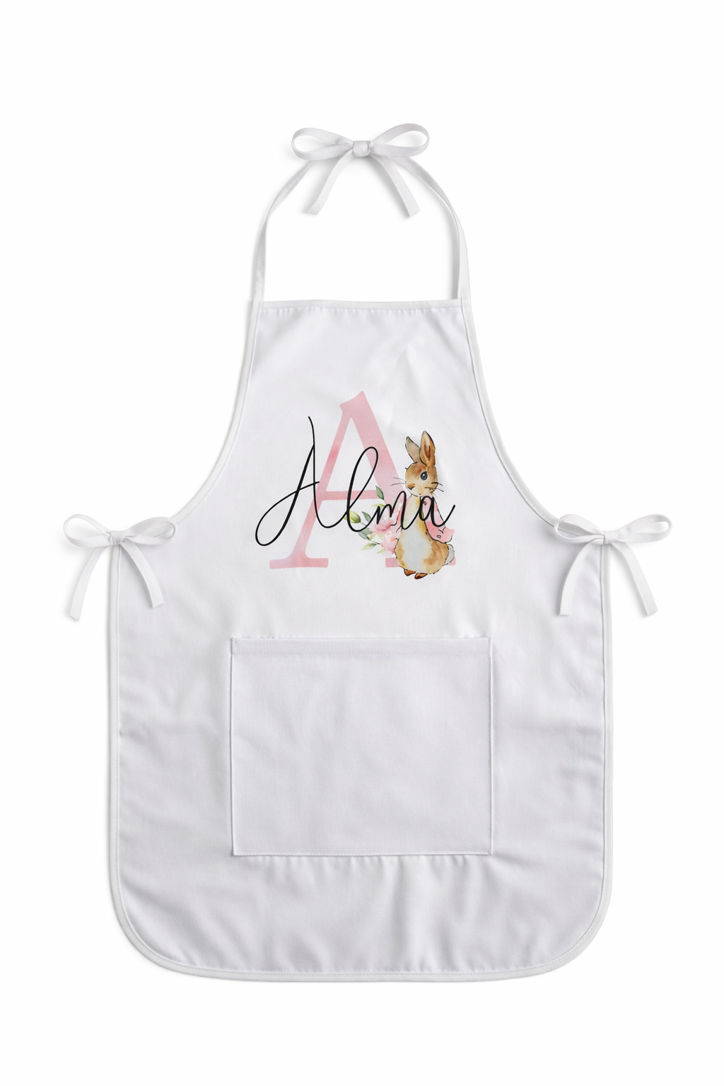 Kommer snart. Personligt børneforklæde (Lyserød)