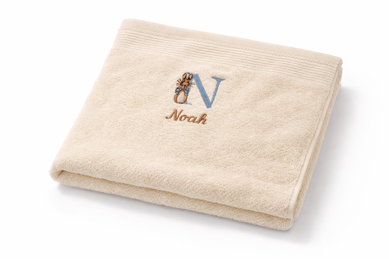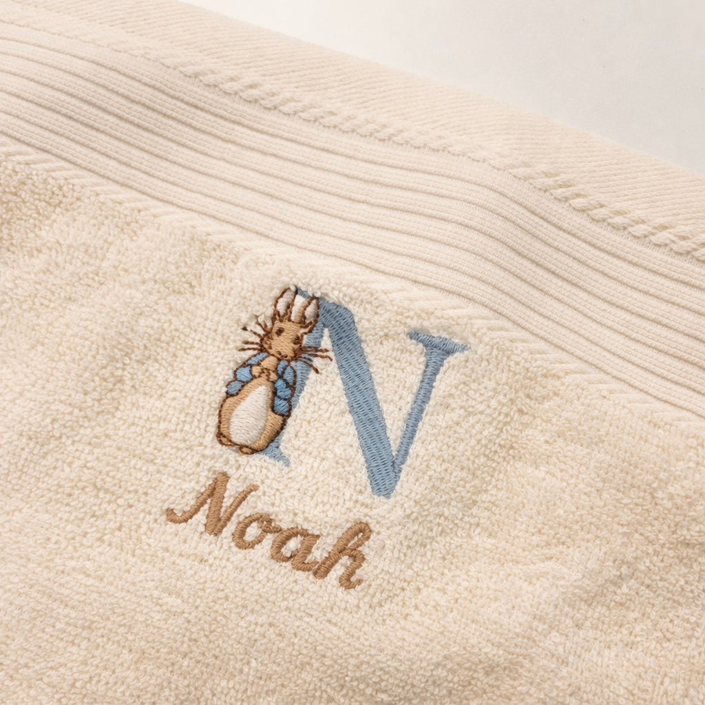 Mjuk och ekologisk handduk med broderad Pelle Kanin och broderat namn.