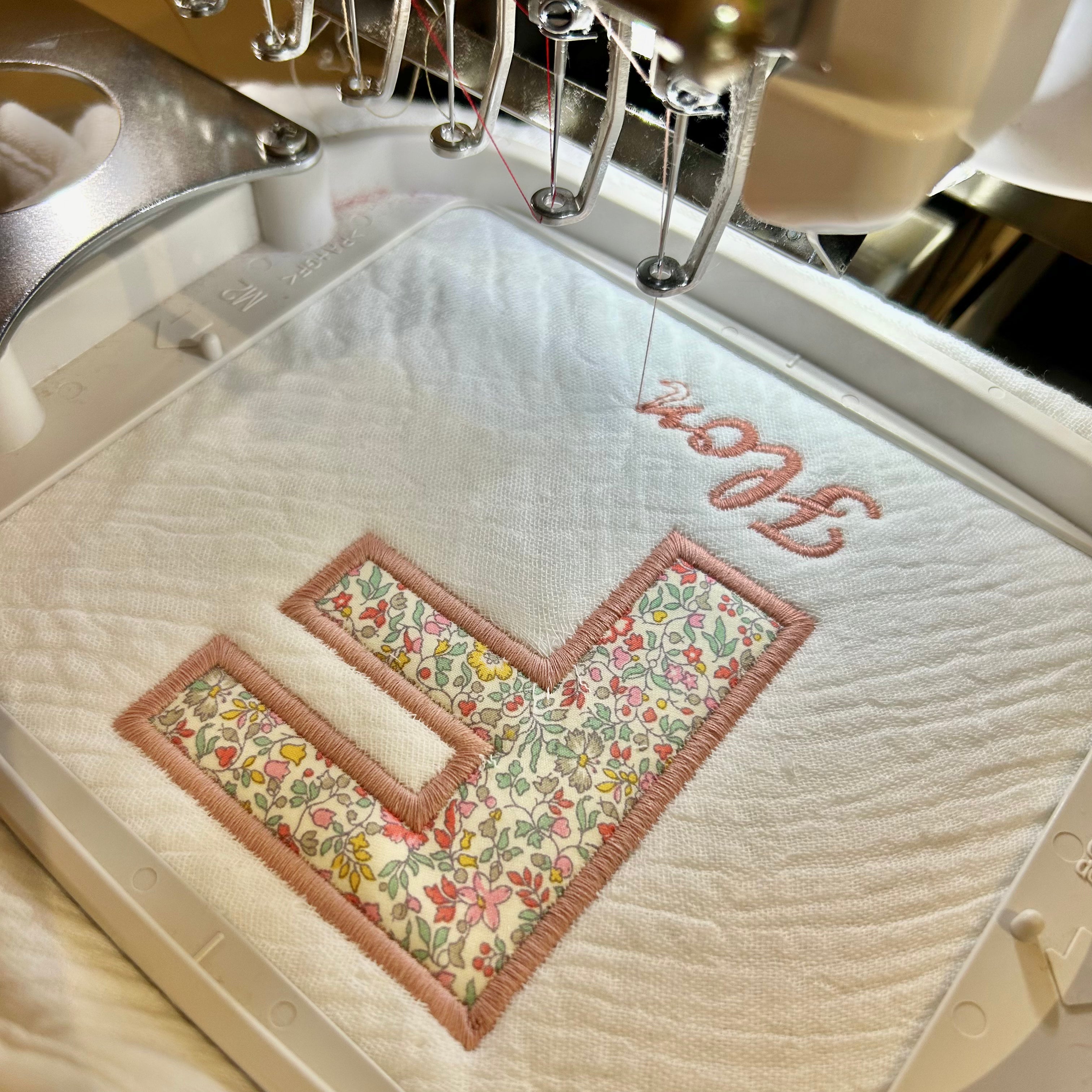 Babyhandduk med broderad Liberty tygbokstav är en fin och personlig present.