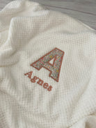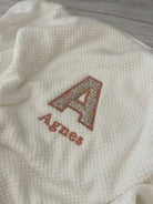 Söt och mjuk babyfilt med broderad bokstav i Liberty-tyg och broderat namn.