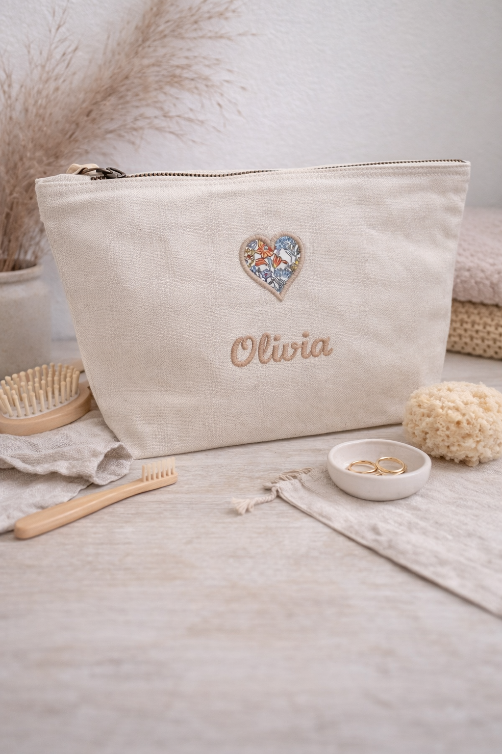 Söt och praktisk necessär med broderat Liberty-tyghjärta och broderat namn.